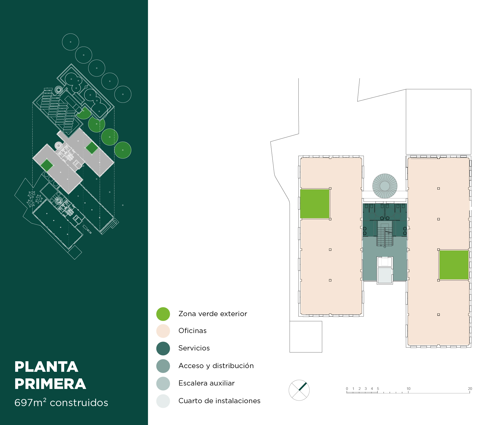 Mediante la proyección de jardines se propone ser partícipe activo del lugar; haciendo de ello un ámbito de trabajo agradable. Se proyecta arquitectónicamente una individualización de accesos e independencia para cada una de las plantas del edificio y una accesibilidad desde cada uno de los niveles a un jardín exterior